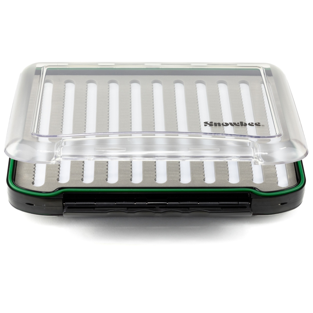 Aimed squarely at the competition fly fisher or serious fly tier, who wants large capacity, in one box, easily accessible. Fitted with Snowbee's popular slit-foam design in light grey with white background, which coupled with the clear lids, allows for clear, quick fly identification. This large fly box has 11 rows of fly foam each side and holds up to 708 flies.