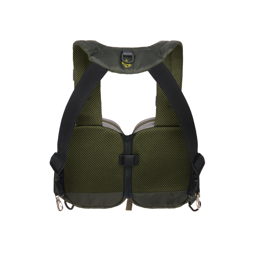 The two main chest compartments zip together in the centre and also have an elasticated centre strap, to allow more freedom of movement on hot days. The entire shoulder straps and pocket assembly have an air-mesh rear lining, to help keep you cool on hot days and the elasticated side straps are fully adjustable, meaning one size fits all.